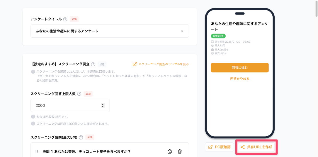 アンケートを作成後、スマホプレビューの下に表示される[共有URLを作成]をクリックします。