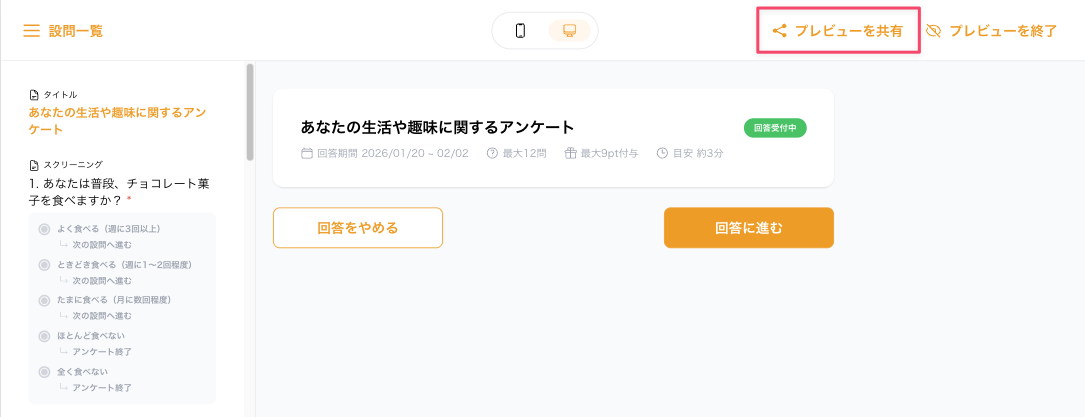 アンケートのプレビューの共有用URL(閲覧専用URL)を発行し、会員登録していない方にも確認してもらうことができます。