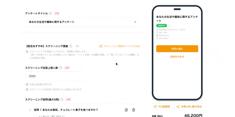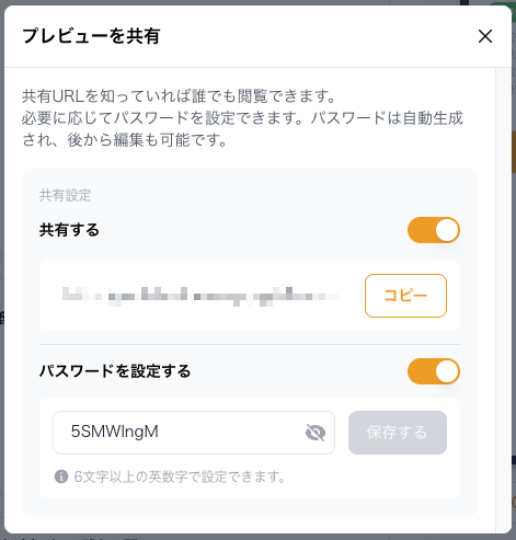 共有URLを知っている方であれば誰でもプレビューを確認でき、必要に応じて閲覧パスワードも設定できます。アンケート画面の社内確認やクライアント確認をよりスムーズに行っていただけますので、ぜひご活用ください。