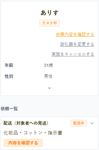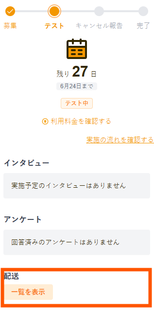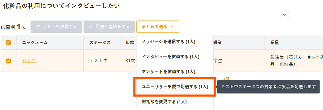 対象者確定後、応募者一覧から選択して「ユニーリサーチ便で配送する」を選びます。