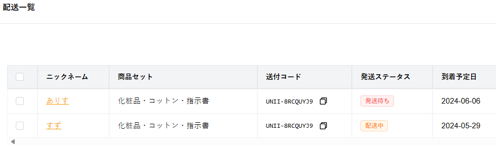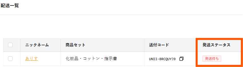 設定が完了すると「発送待ち」になり、ユニーリサーチに製品が届けられ次第発送されるようになります。
