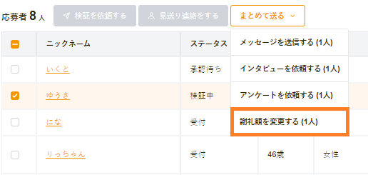 対象者をチェックし、「まとめて送る」から、「謝礼額を変更する」を押下