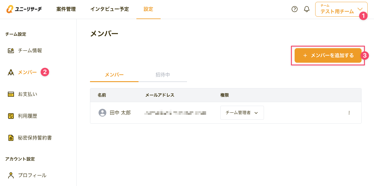 ② 設定>チーム設定から[メンバー]をクリックし、メンバー画面を表示します