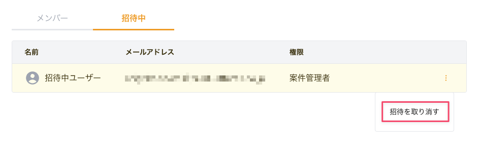 ② 招待を取り消したいユーザーの[⋮]をクリックし、[招待を取り消す]をクリックします
