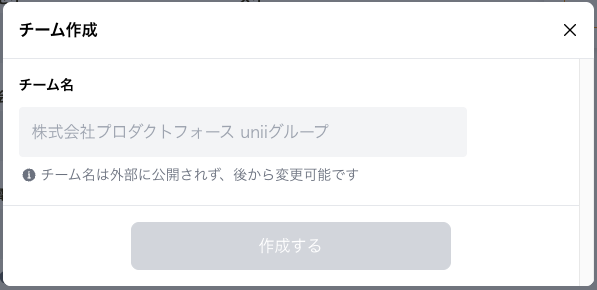② チーム作成のダイアログが表示されますので、チーム名を入力し、[作成する]をクリックします。