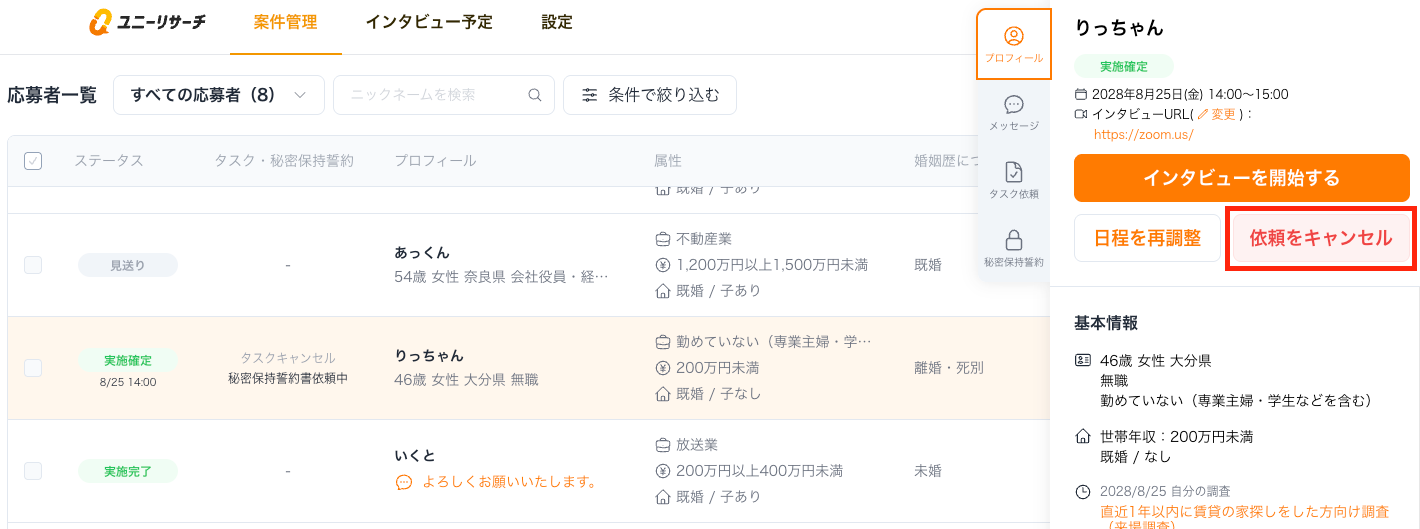 決済後にインタビューを予定通り実施することが難しくなった場合にキャンセルの申請が可能です。
