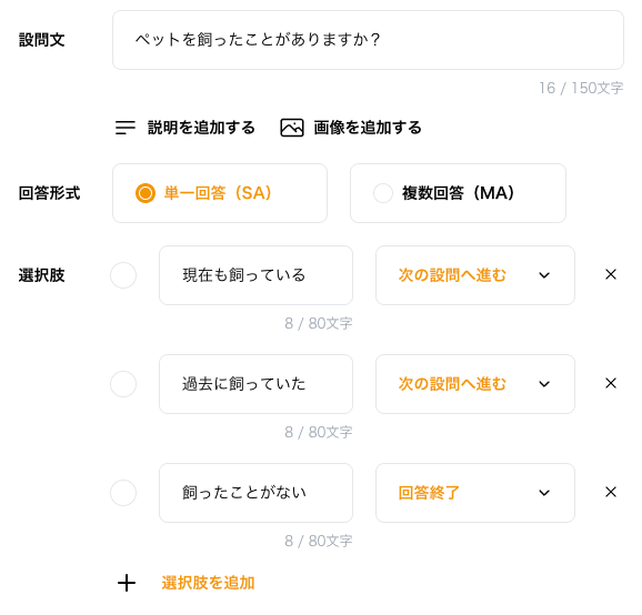 スクリーニング調査では、単一回答(SA)、複数回答(MA)の回答形式を使って設問と分岐を作成します。