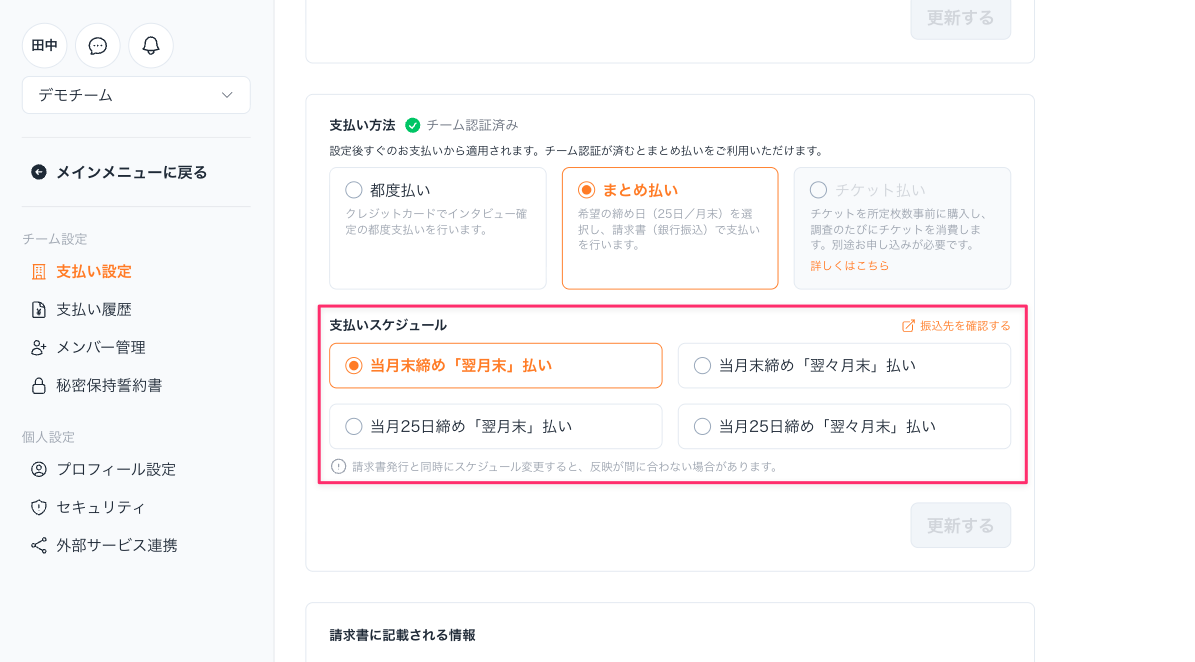 ユニーリサーチでは、貴社の経理フローに合わせて、請求書の締め日を以下の2パターンから選択いただけます。 設定は「設定 > お支払い」画面から変更可能です。