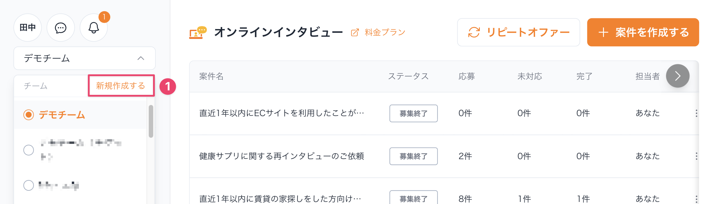チームに所属すると、そのチームで作成・実施された案件を確認できるようになります。
