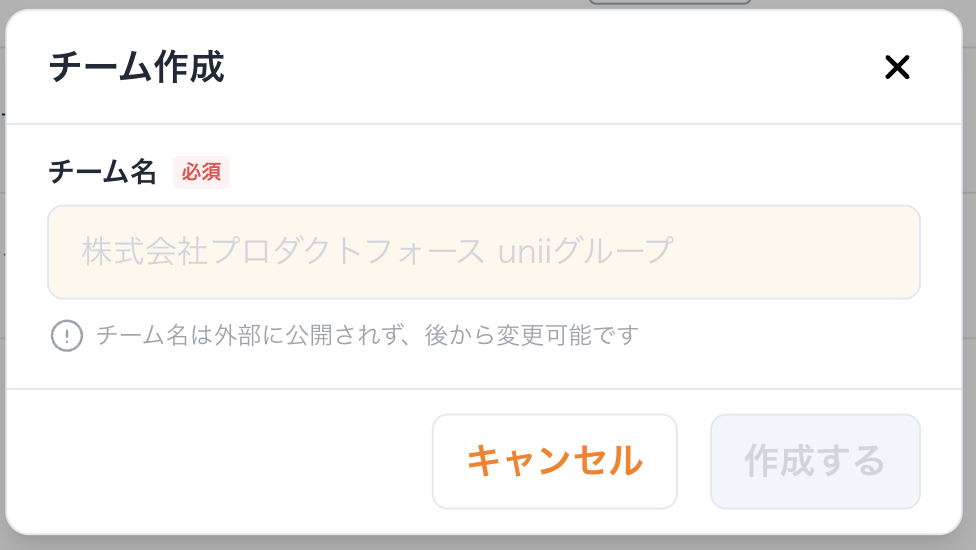 ② チーム作成のダイアログが表示されますので、チーム名を入力し、[作成する]をクリックします。