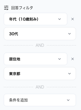 設定した項目をすべて満たす回答データに絞り込んで集計されます。(AND条件)