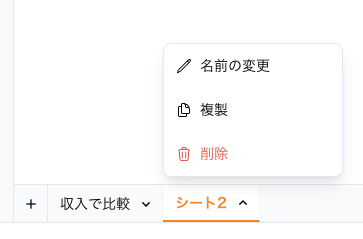 削除:メニュー内の[削除]をクリックするとシートを削除できます