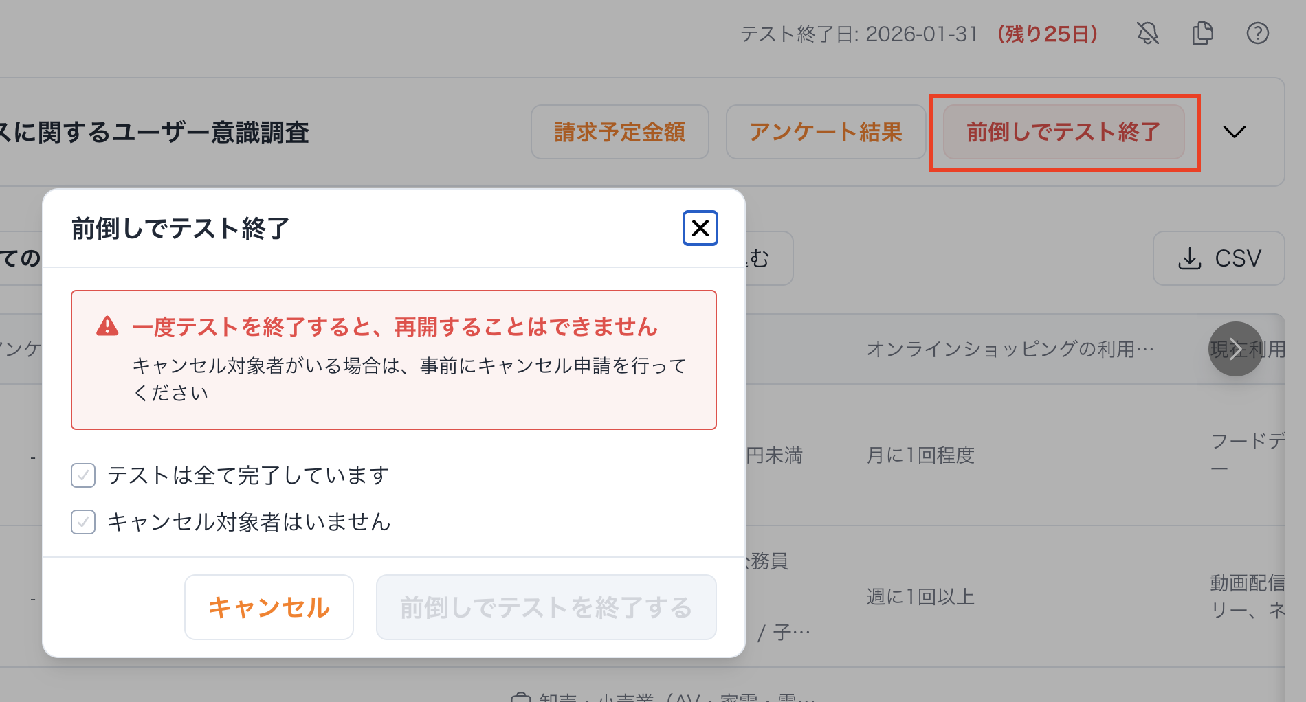 テスト終了の撤回はできません。必ずすべての調査協力者のテスト工程が完了したことを確認してから、終了をしてください。
