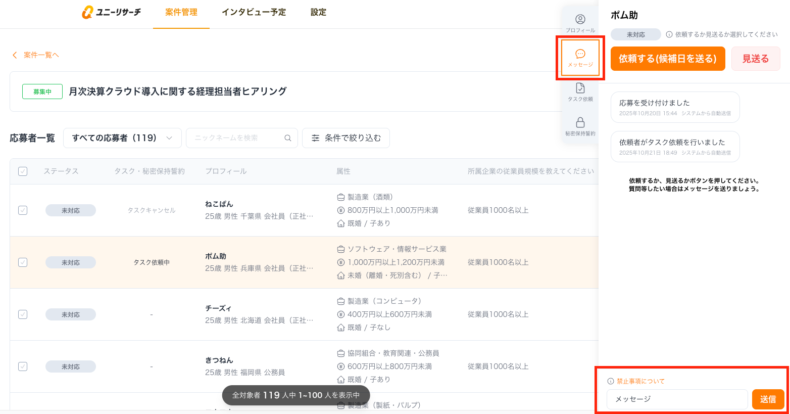 応募者一覧を開き、メッセージを送りたいユーザーの名前をクリックしてください。