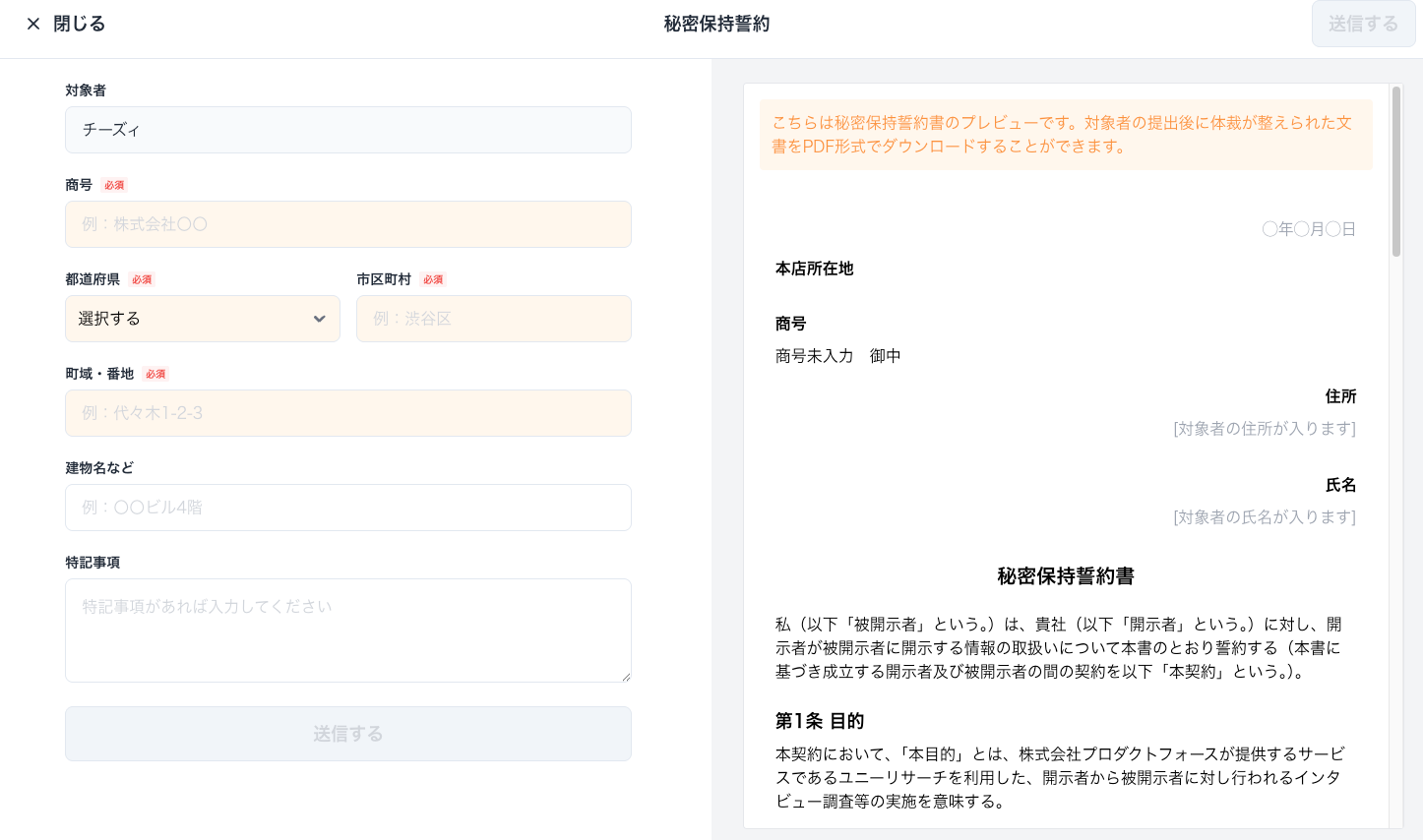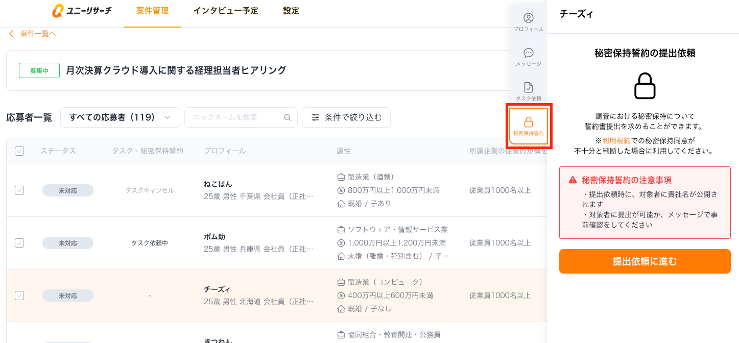 ユニーリサーチでは、サービス利用規約やインタビュー応募時の同意取得で、調査対象者に対して守秘義務を課すことで調査の機密性を実現していますが、対象者と直接の秘密保持に関する書面取り交わしを行いたい場合は、本機能をご利用ください。