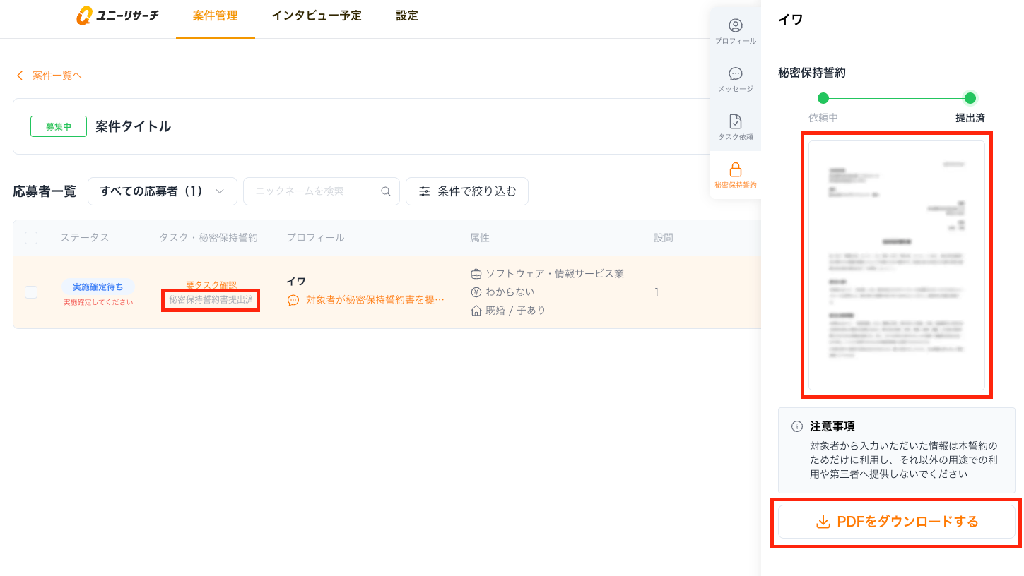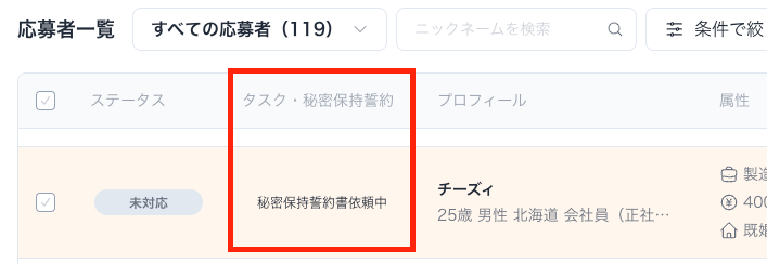 応募者一覧の「タスク・秘密保持誓約」でステータスの確認を行うことができます。