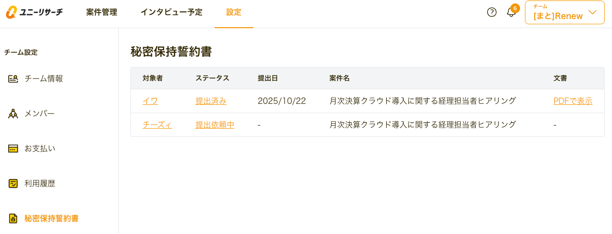 設定 > 秘密保持誓約書より、一覧で確認することも可能です。