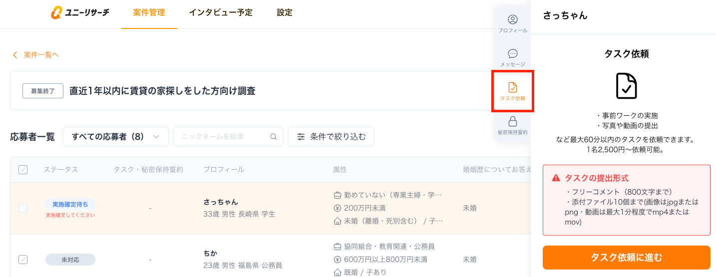Proプランではインタビュー対象者に対して、インタビューとは別に事前課題の提出を依頼することが可能です。