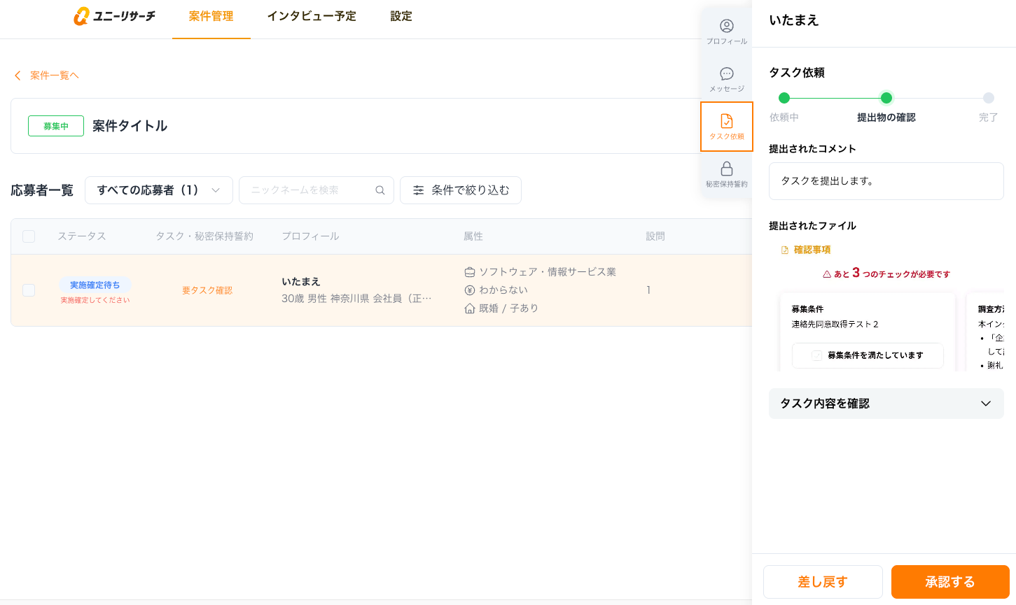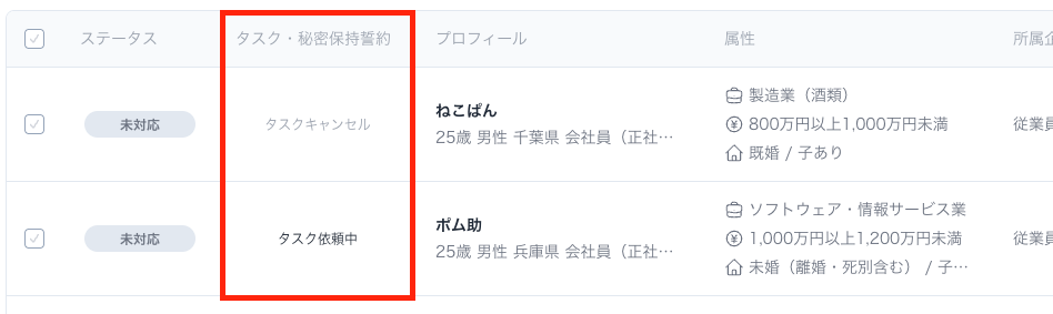 応募者一覧の「タスク・秘密保持誓約」でステータスの確認を行うことができます。