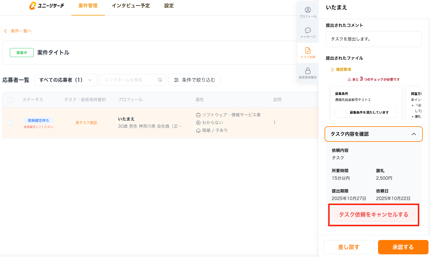 何らかの事情でタスク提出依頼を中断したい場合は、「タスク内容を確認」からキャンセル申請をすることができます。