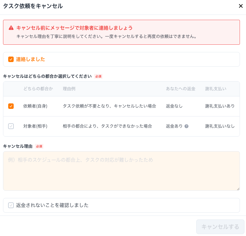 依頼者(自身)都合のキャンセル・・・返金なし