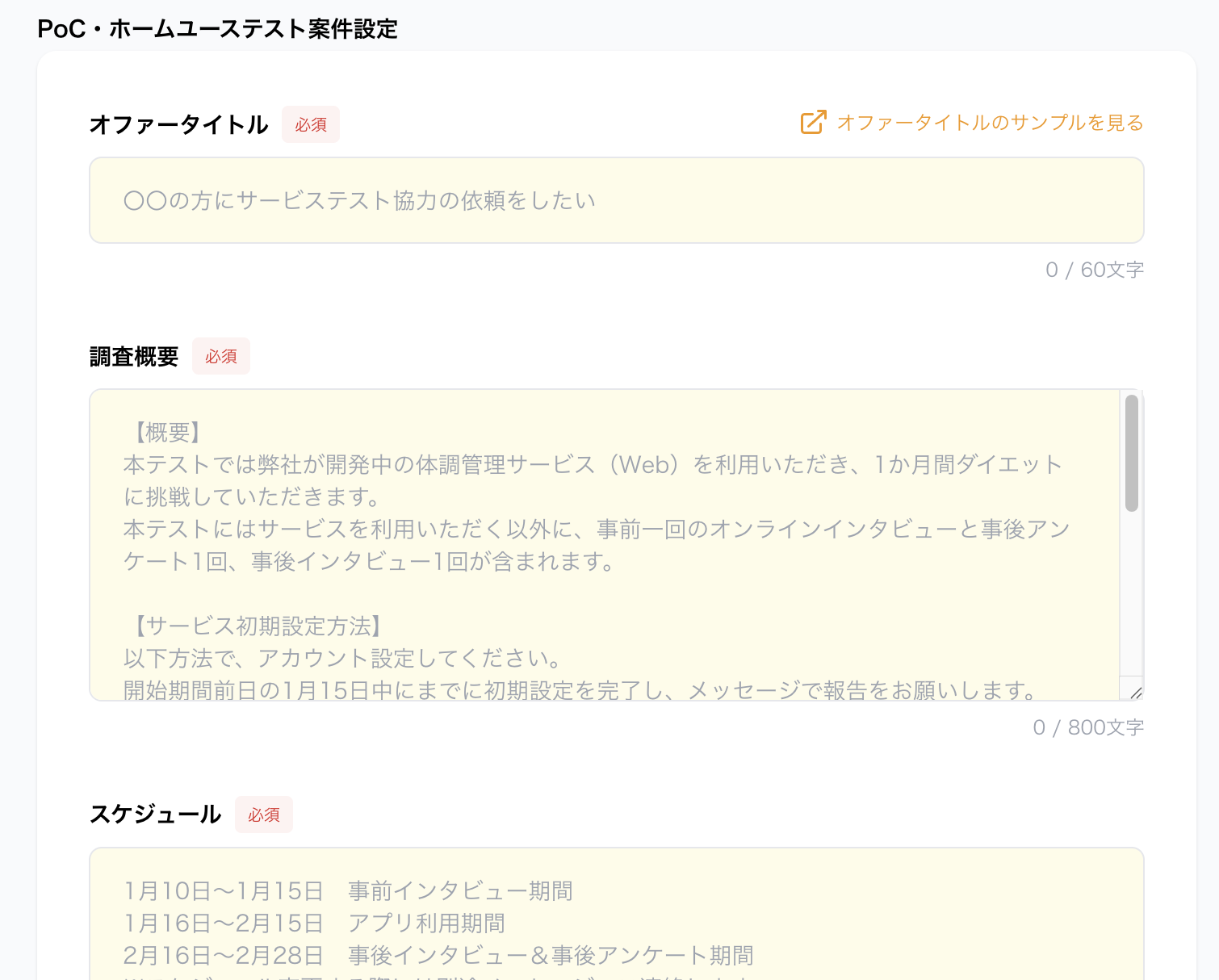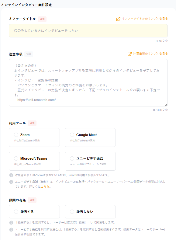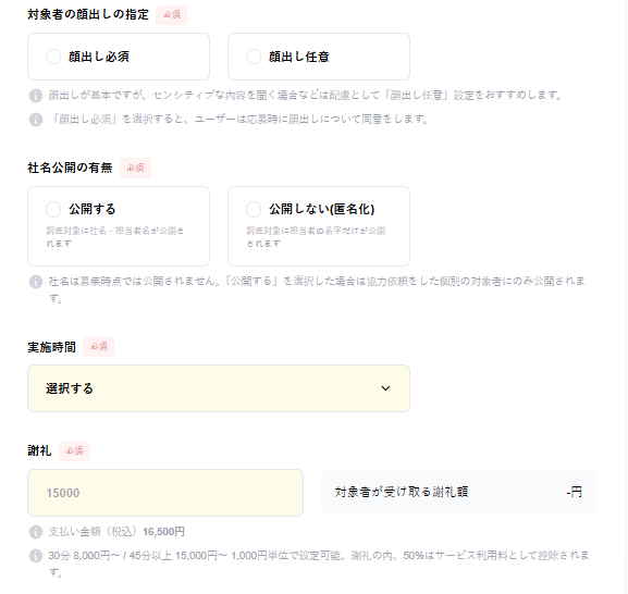 通常案件と同様、タイトルや利用ツール、謝礼金額等の設定ができます。