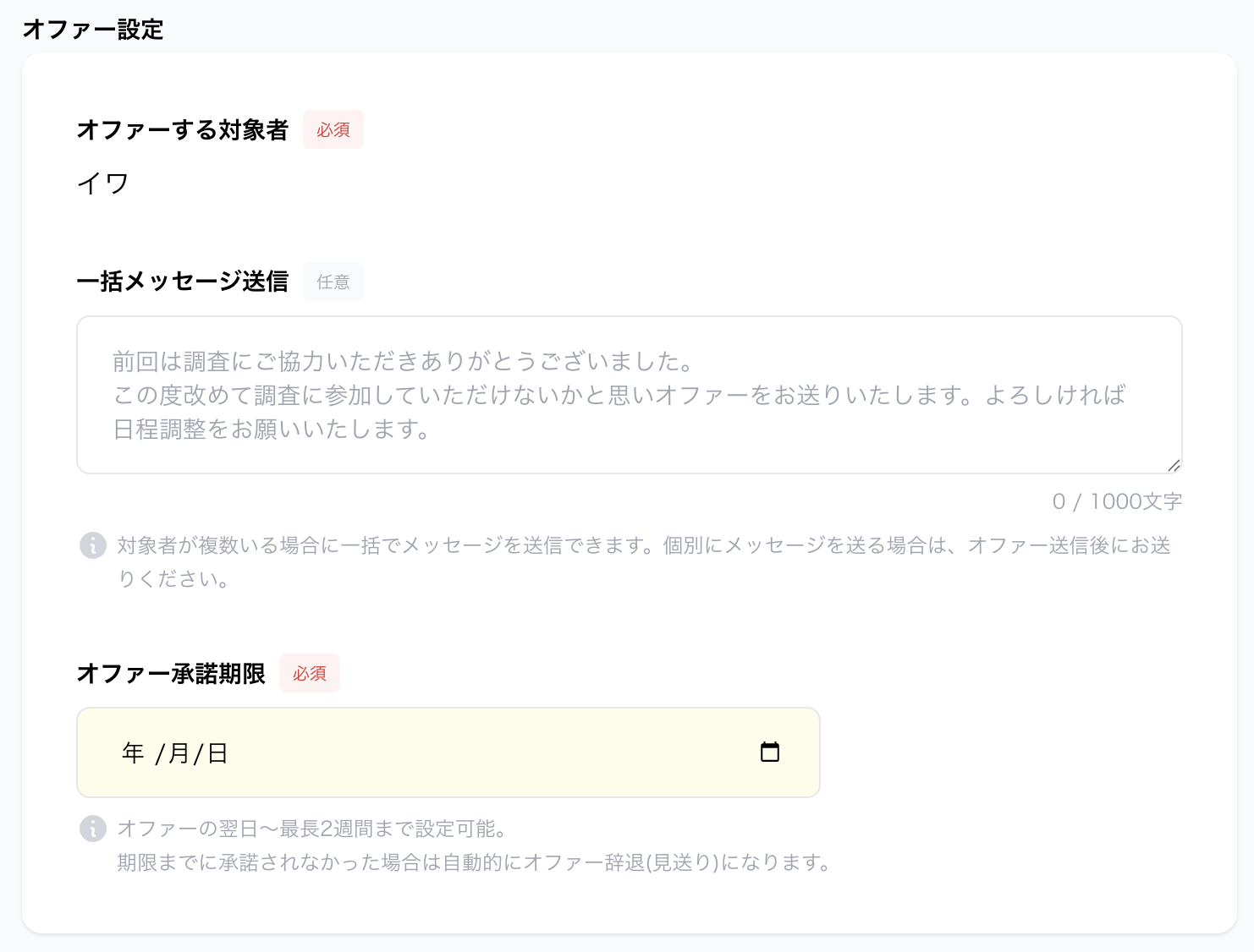 オファーには「メッセージ」と「承諾期限」を設定できます。