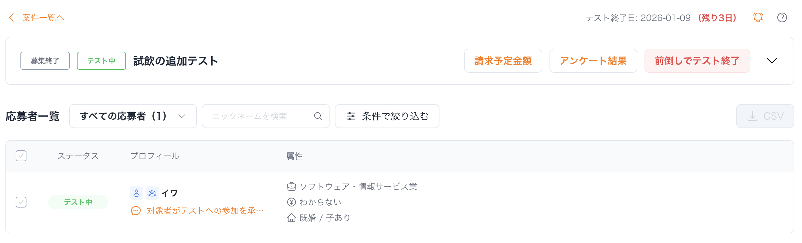 オファー承諾があると、ステータスが「テスト中」に変わります。