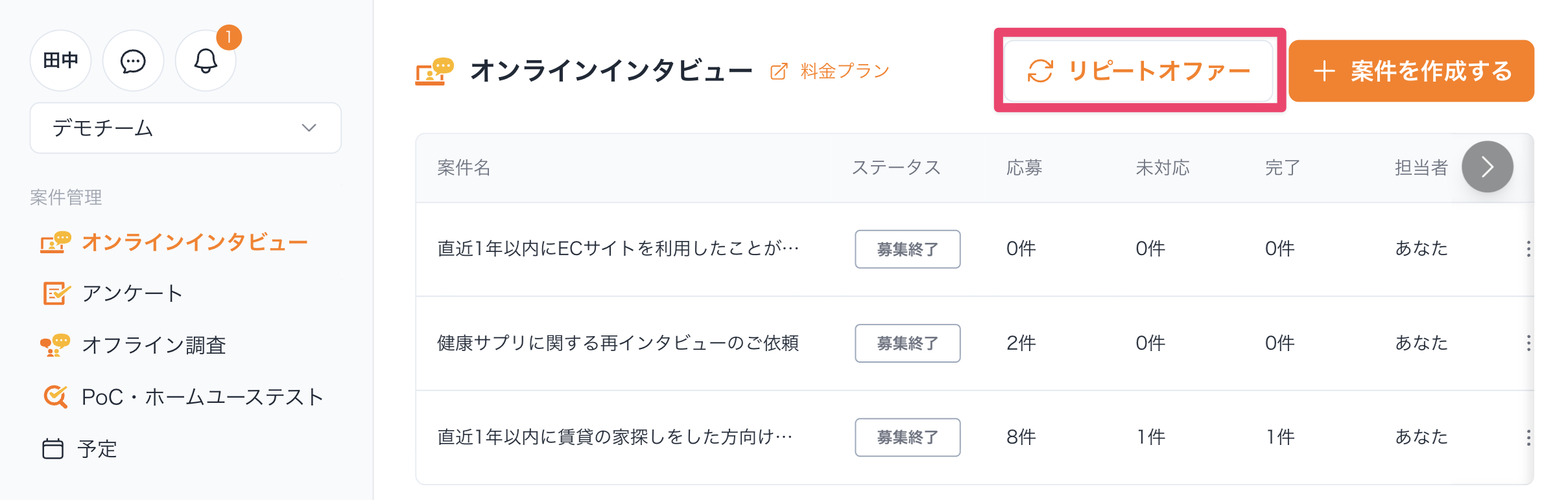 1.リピートオファーをしたい案件の一覧画面にアクセスし、[リピートオファー]をクリックします