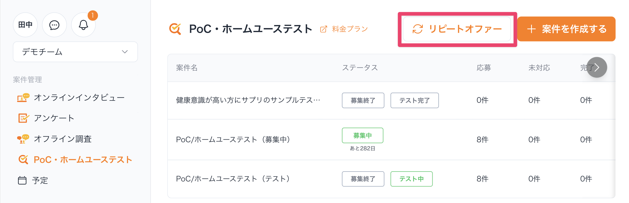 1.メニューからPoC・ホームユーステストにアクセスし、[リピートオファー]をクリックします