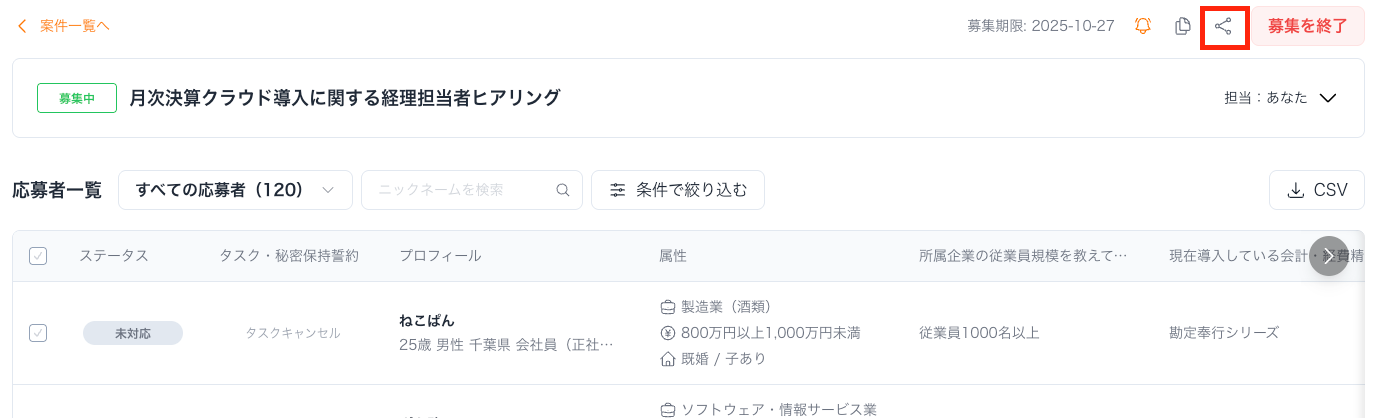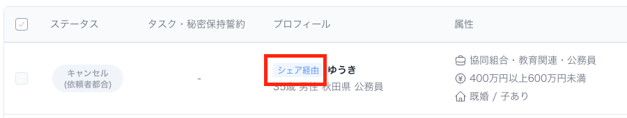 SNSシェア経由での応募の方には、プロフィール欄にシェア経由と表示されます。