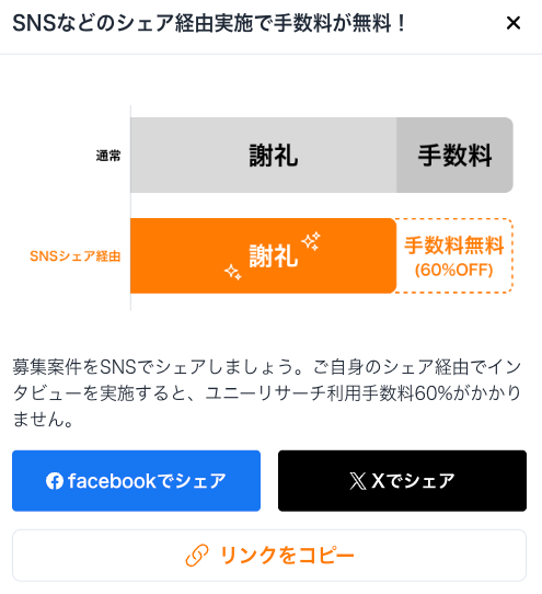 SNSシェアをしている案件でも、ユニーリサーチからの直接応募の方のインタビューについては、手数料は無料にはなりません。