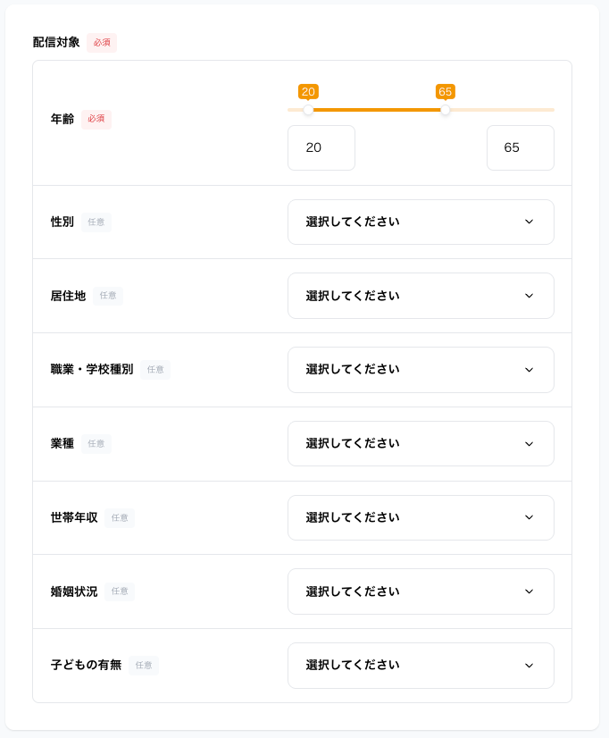 例)20~40代の男性向け調査の場合→年齢:20~49、性別:男性 に設定