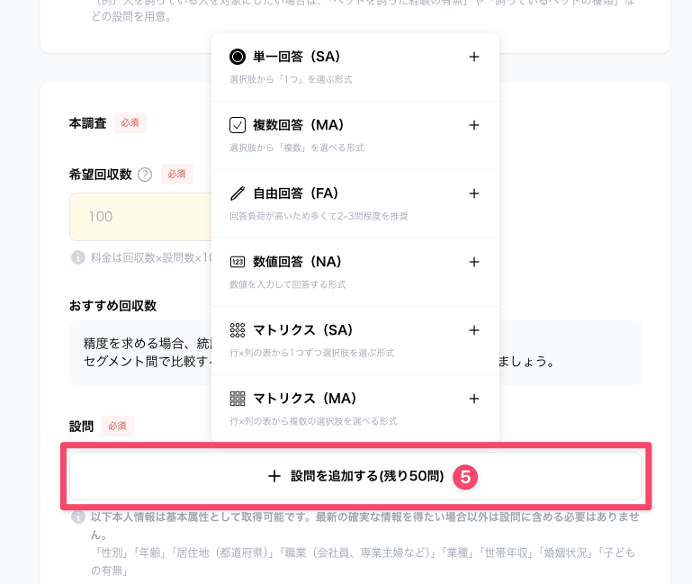 設問作成画面では、最大50問のアンケート調査票を作成できます。