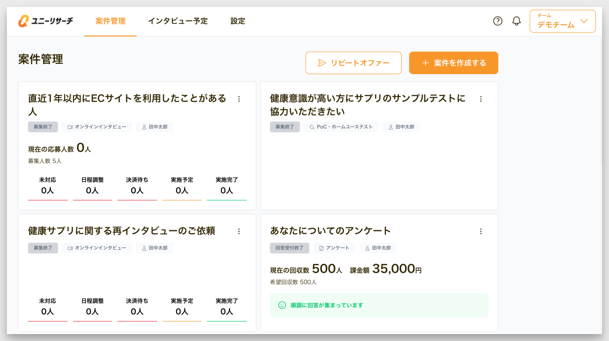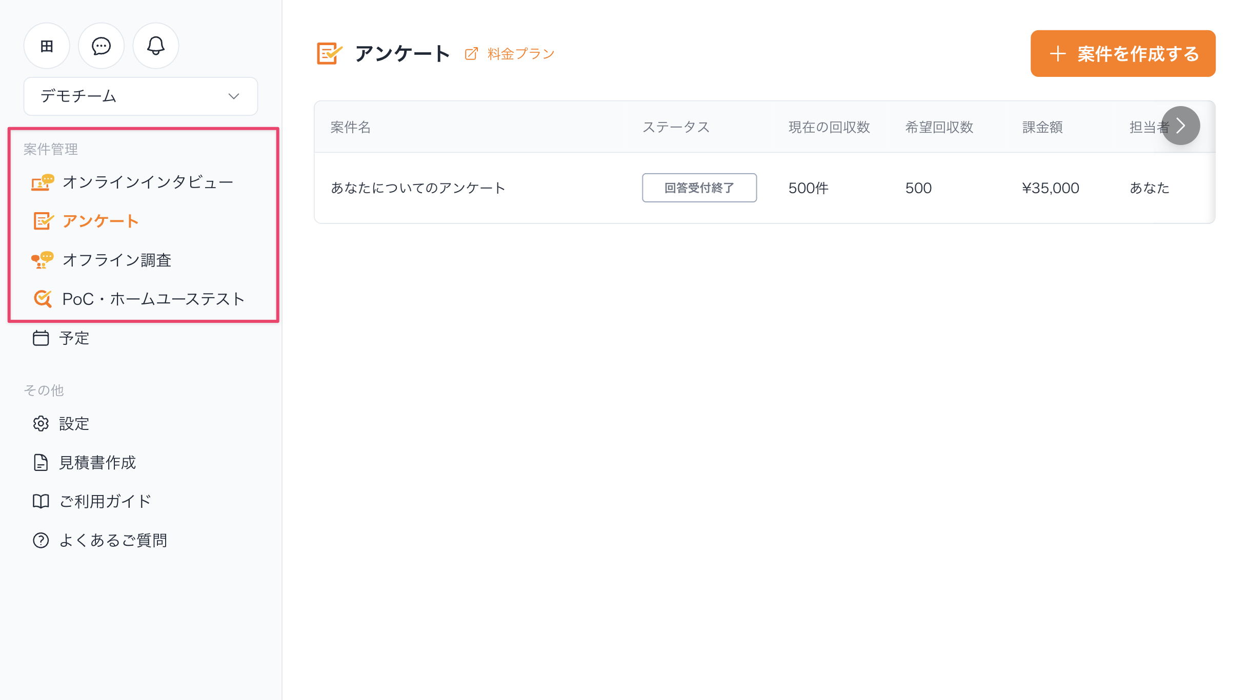 案件作成はサービスごとの一覧画面で行っていただけます。